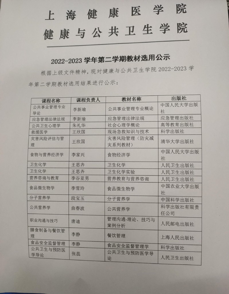 根据上级文件精神,现对健康与公共卫生学院2022-2023学年第二学期教材选用结果进行公示: