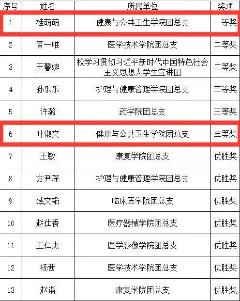 我院桂萌萌、叶淑文同学围绕“学习新思想,争做好青年”主题展开了演讲,结合自身专业学习和学科领域前沿发展,选取适当的视角,通过理论阐释、案例分析等相结合的方式,把个人的小我融入国家和民族的大我之中,充分展现新时代追梦人的精气神。经过一系列精彩激烈的角逐,分别荣获一等奖、三等奖,健康与公共卫生学院团总支荣获优秀组织奖。