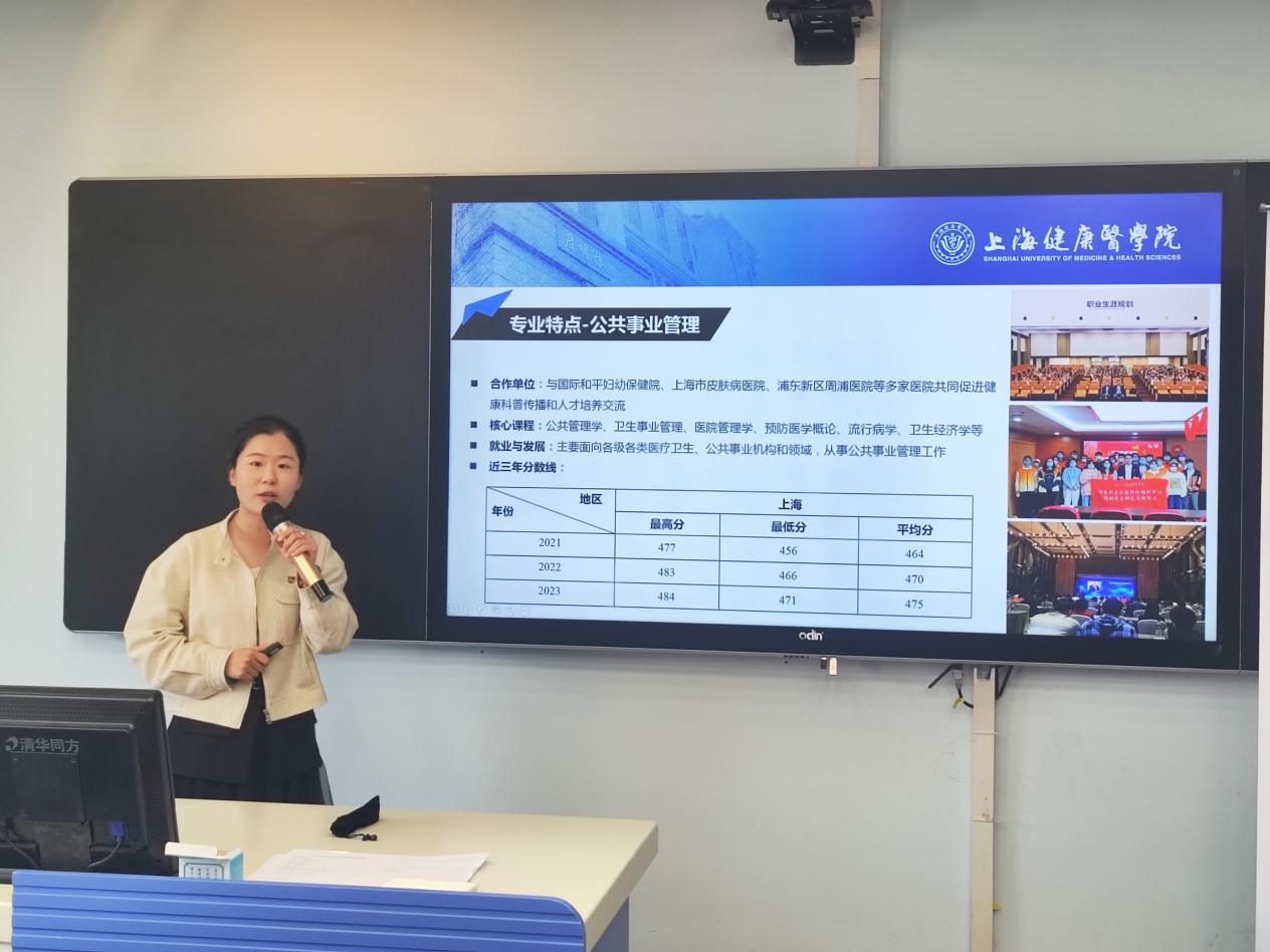 招生宣讲会中,邱晨主要从学校概况、办学特色、就业情况、校园环境、专业特点等方面进行介绍,帮助卢湾高级中学学子更全面地了解我校的发展历程和人才培养情况。现场学子热情高涨,他们从升学发展、未来就业等方面进行积极发言、踊跃提问。招生宣讲团队进行了耐心答疑并发放了宣传资料,提供了更多招生答疑渠道,鼓励动员更多优秀学子报考上海健康医学院。